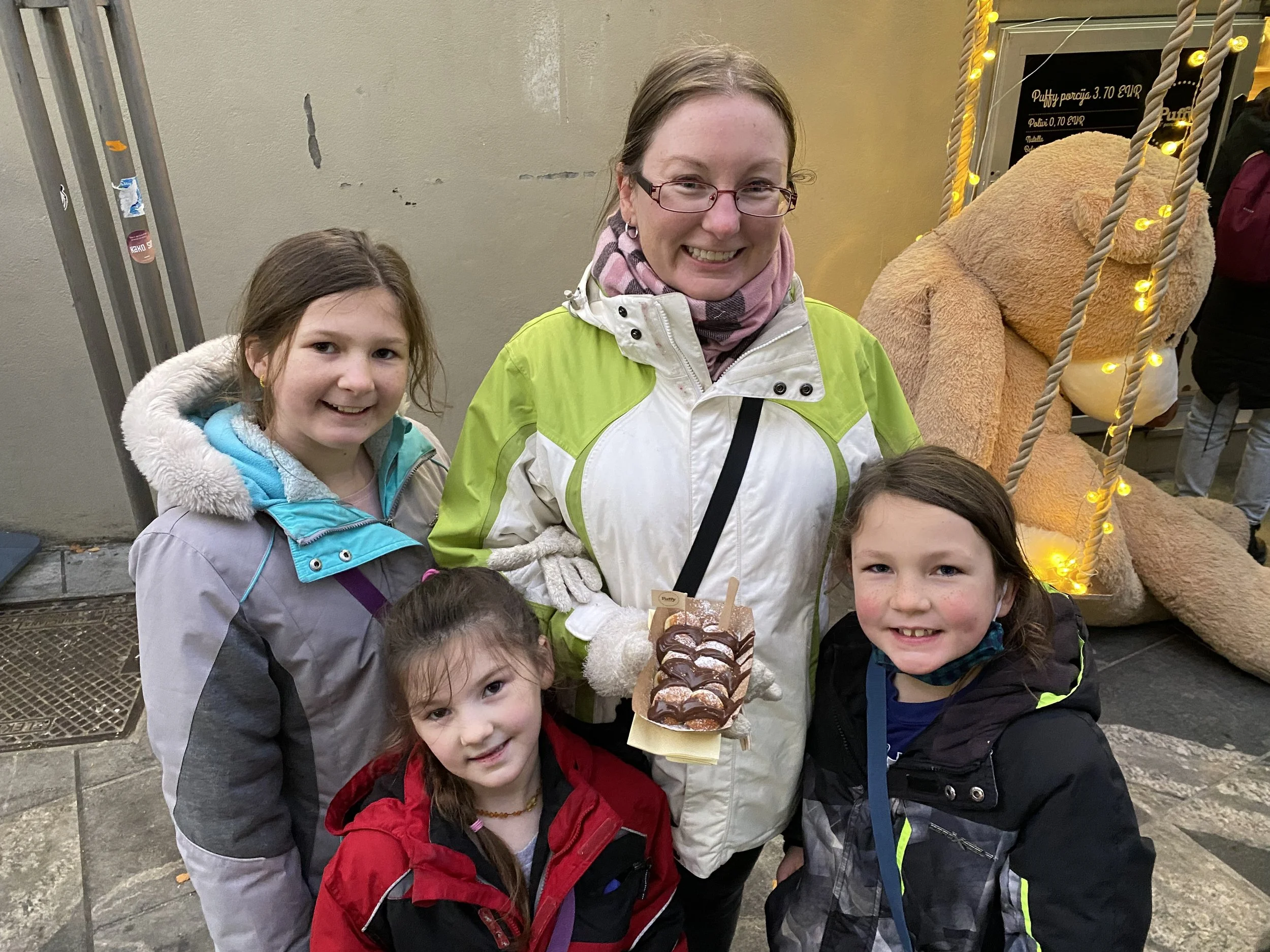 We walked around the picturesque Old Town area, which is mostly a pedestrian area. There were lots of shops, stalls, and Christmas vendors. There were many people selling roasted chestnuts and candied nuts. The kids tried roasted chestnuts when we went to Gödöllő, and they did not like them! We walked by one guy who was actually making the candied almonds there, and said to JonPaul, “You’ve got to try my hot nuts!” Of course, we had to try some then! They were really good, and for the rest of the time we were in Ljubljana the kids kept asking to go back to get more ‘hot nuts’.